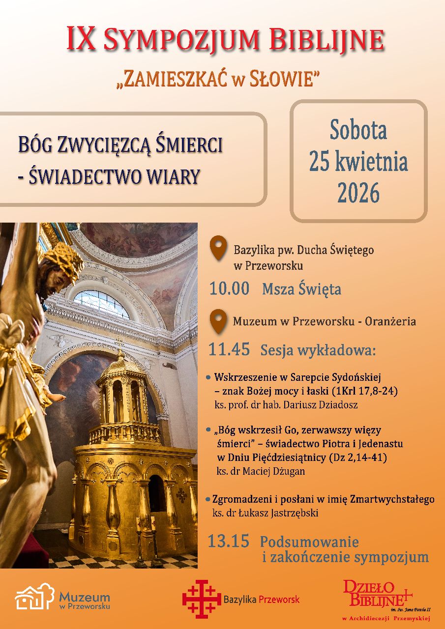Dzieło Biblijne im. św. Jana Pawła II, Przeworska Kapituła Kolegiacka i Muzeum w Przeworsku, serdecznie zapraszają na IX sympozjum biblijne Zamieszkać w Słowie. Wydarzenie organizowane jest na zakończenie XVIII ogólnopolskiego Tygodnia Biblijnego, w sobotę 25 kwietnia 2026 roku w Przeworsku. Adresowane jest ono do członków i sympatyków Dzieła Biblijnego, parafialnych grup biblijno-modlitewnych oraz do wszystkich zainteresowanych indywidualną i rodzinną lekturą i modlitwą Pismem Świętym. Szczegółowy program i tematyka wykładów poniżej:
